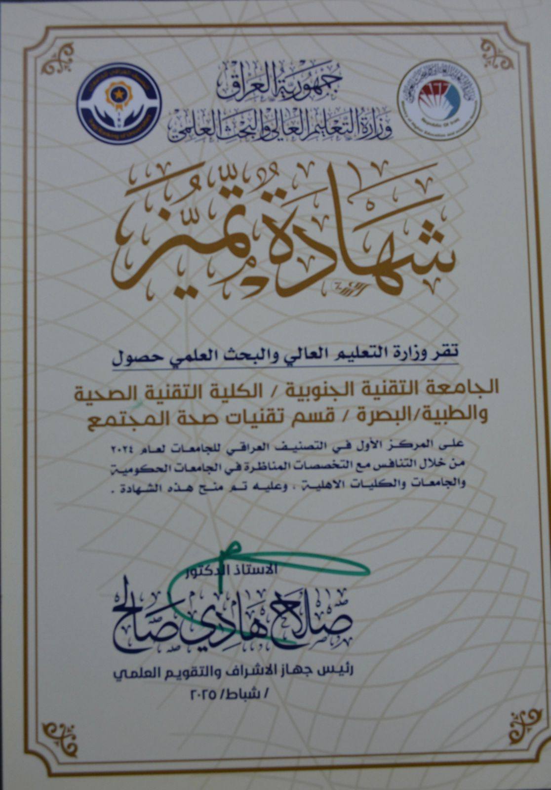هذا وقد تم تكريم الكلية / قسم تقنيات صحة المجتمع بشهادة التميز للمركز الاول في التصنيف العراقي للعام ٢٠٢٤ من قبل السيد رئيس جهاز الإشراف والتقويم العلمي في وزارة التعليم العالي والبحث العلمي الاستاذ الدكتور صلاح هادي صالح .