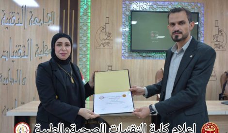 السيد عميد كلية التقنيات الصحية والطبية يكرم عدد من أساتذة ومنتسبي الكلية بكتاب شكر وتقدير