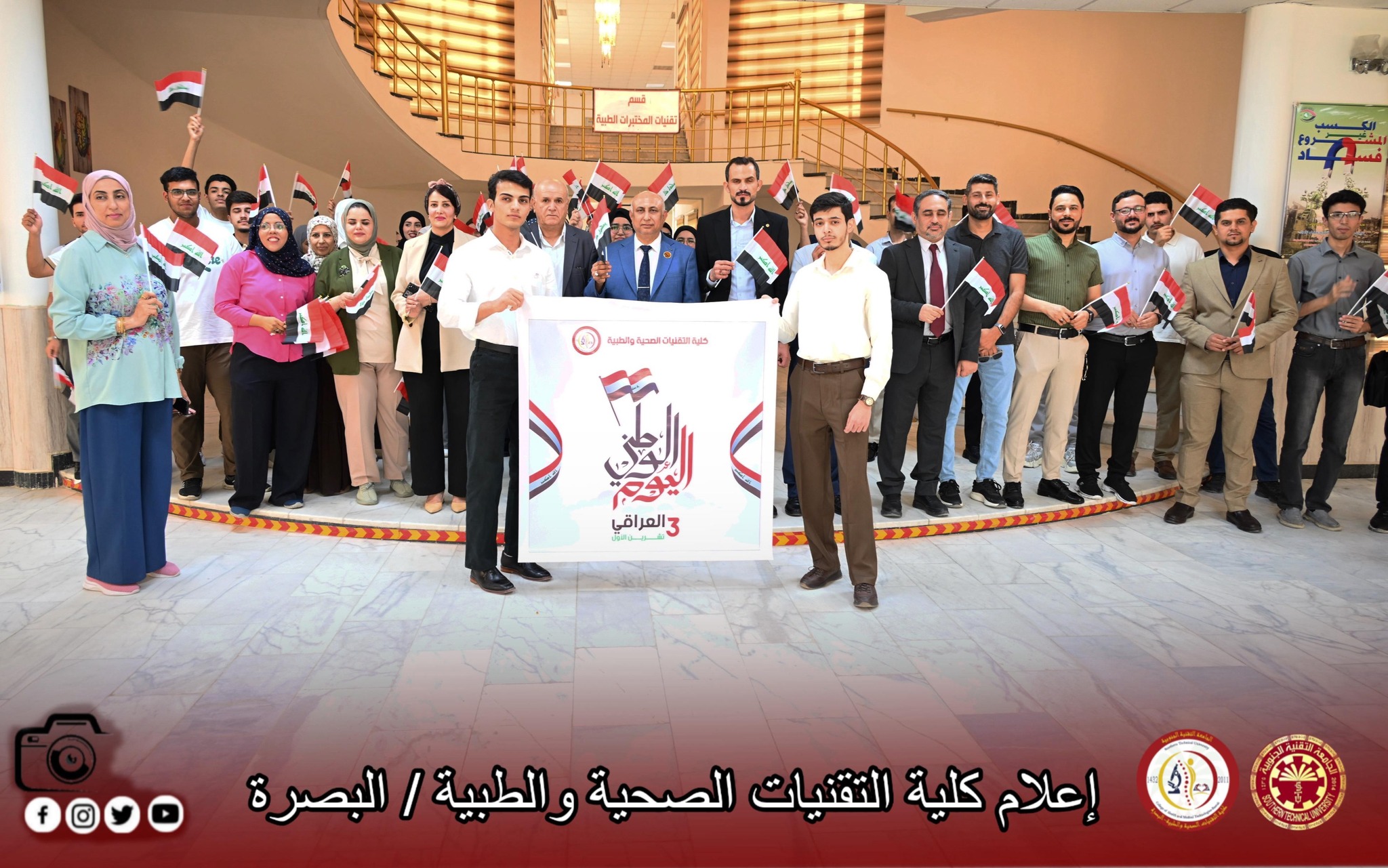 أقامت كلية التقنيات الصحية والطبية ، صباح اليوم وقفة ابتهاج واعتزاز بمناسبة اليوم الوطني، بحضور السيد عميد الكلية الاستاذ الدكتور علاء كاظم جاسم ومعاون العميد للشؤون العلمية الاستاذ الدكتور وسام عبد الامير علي ومعاون العميد للشؤون الادارية والمالية الدكتور أيوب راضي طعمة وأعضاء الهيأة التدريسية والمنتسبين والطلبة، تعبيراً عن الفخر والاعتزاز بالوطن وتجديداً لمعاني الانتماء والولاء.