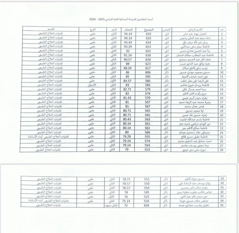 تعلن كلية التقنيات الصحية والطبية عن أسماء الطلبة المقبولين (الوجبة الأولى) في الدراسات المسائية للعام