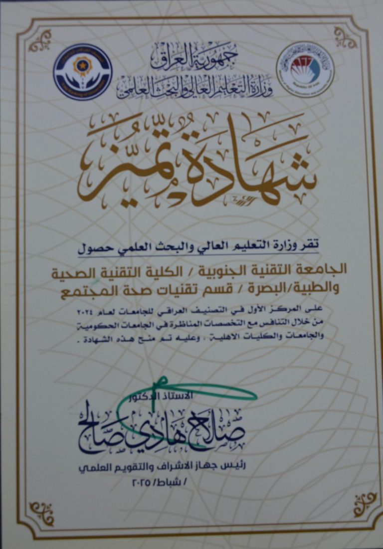 في إنجاز علمي، حصول كلية التقنيات الصحية والطبية في الجامعة التقنية الجنوبية على شهادة تميز
