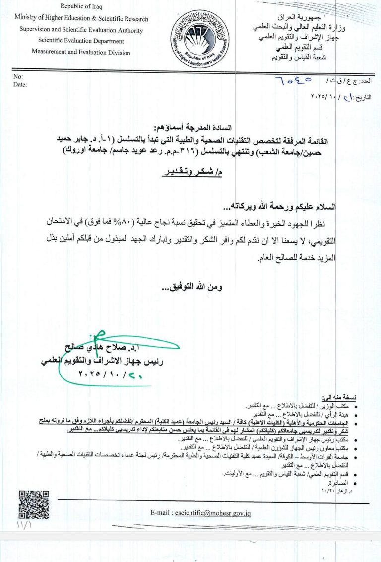 حصول مجموعه من تدريسي كليه التقنيات الصحية والطبية على كتاب شكر وتقدير من ا.د.صلاح هادي