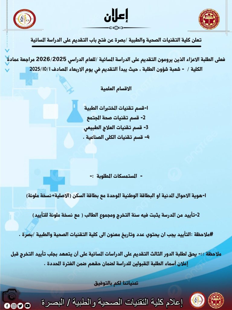 تعلن كلية التقنيات الصحية والطبية /بصرة عن فتح باب التقديم على الدراسة المسائية