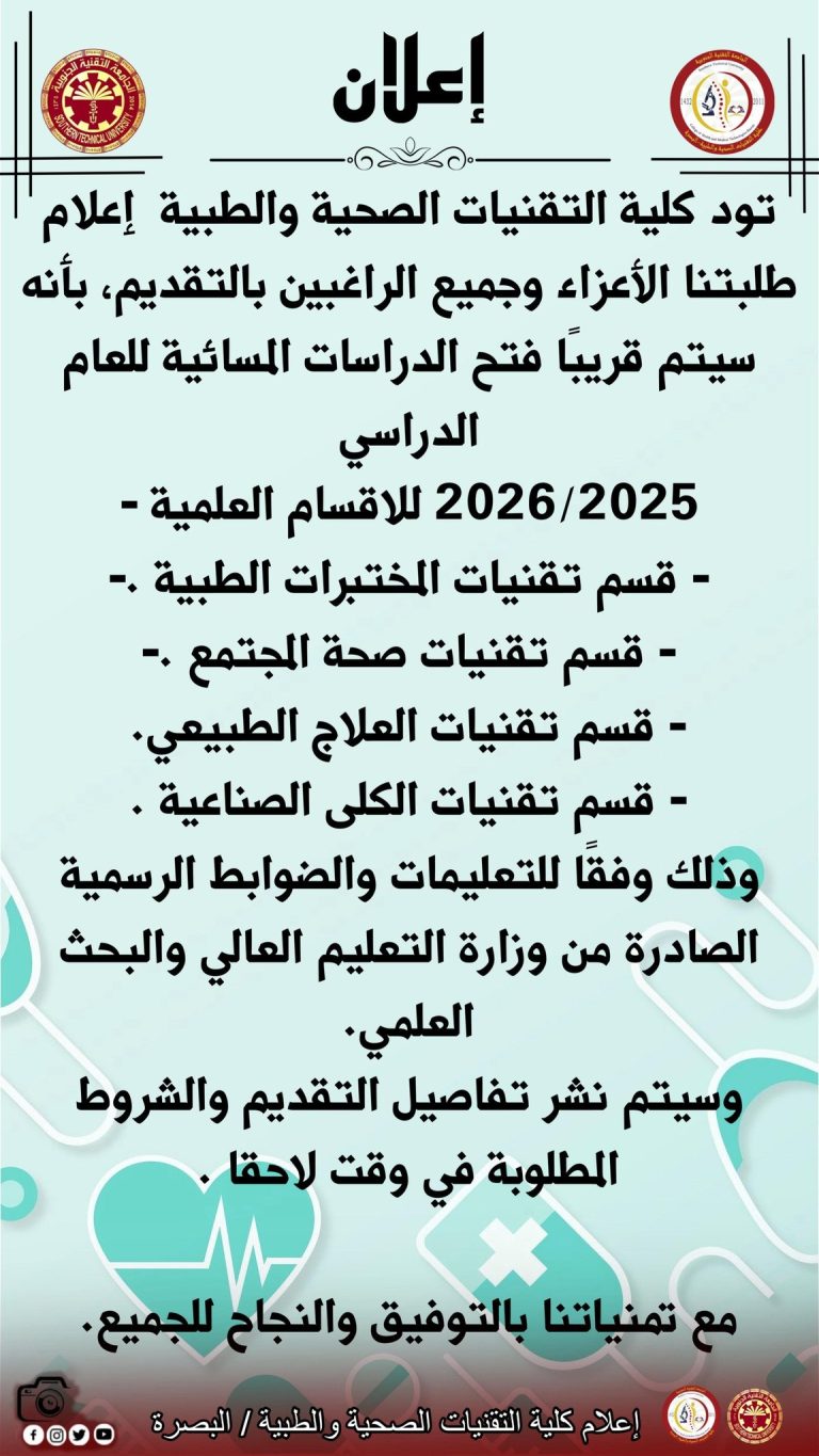 تود كلية التقنيات الصحية والطبية إعلام طلبتنا الأعزاء وجميع الراغبين بالتقديم، بأنه